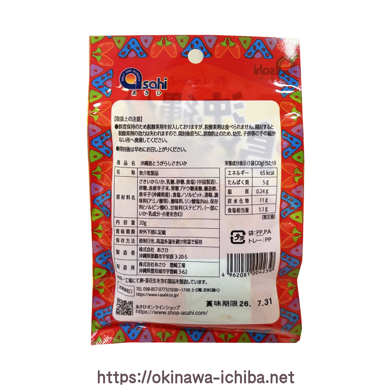 | 原材料 | さきいか(いか、乳糖、砂糖、食塩)(中国製造)、砂糖、赤唐辛子粉末、果糖ブドウ糖液糖、醸造酢、唐辛子(沖縄県産)、食塩/ソルビット、酒精、調味料(アミノ酸等)、酸味料、リン酸塩Na、保存料(ソルビン酸K)、甘味料(ステビア)、(一部にいか・乳成分・小麦を含む) |
