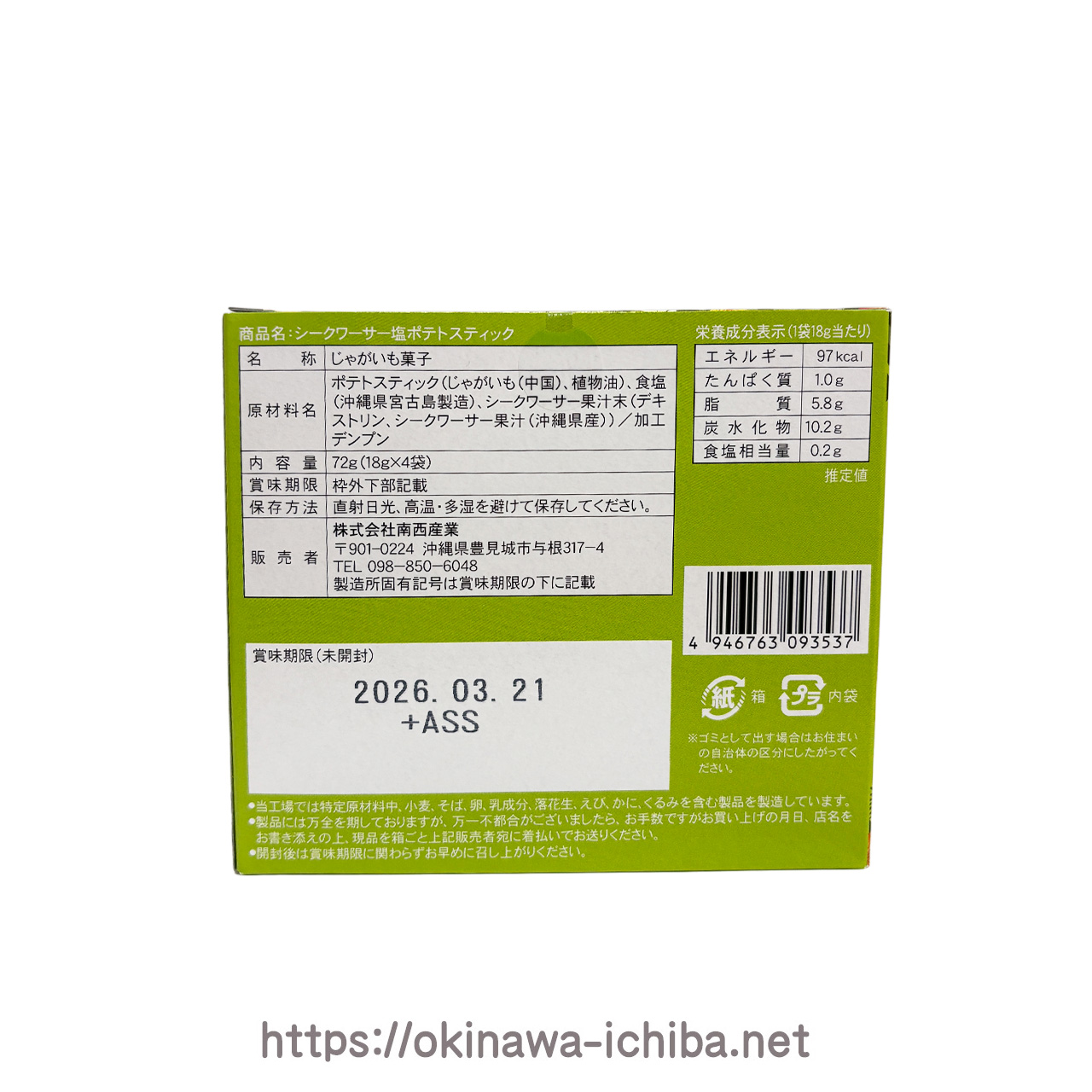 | 原材料 | ポテトスティック(じゃがいも(中国)、植物油)、食塩(沖縄県宮古島製造)、シークワーサー果汁末(デキストリン、シークワーサー果汁(沖縄県産))/加工デンプン |